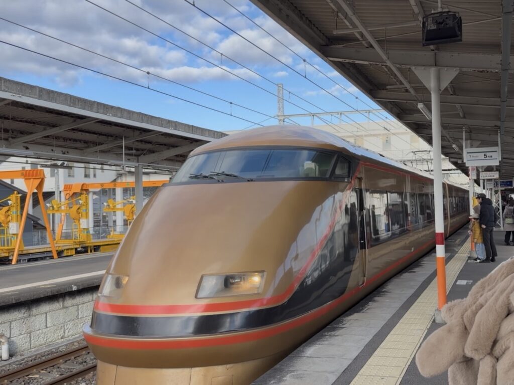 旅の始まりは新鹿沼駅から。ホームで待っていた私たちを迎えに来てくれたのは、なんと黄金に輝く「日光詣(にっこうもうで)」仕様の特別車両!年末というタイミングにふさわしい神々しい姿に、一気にテンションが上がりました。