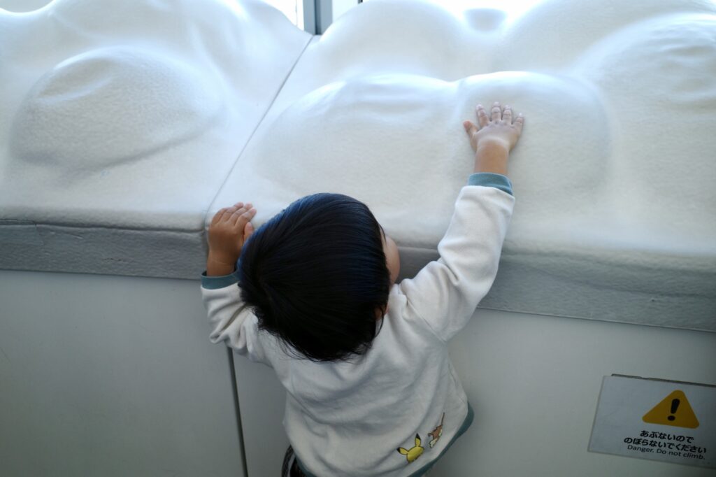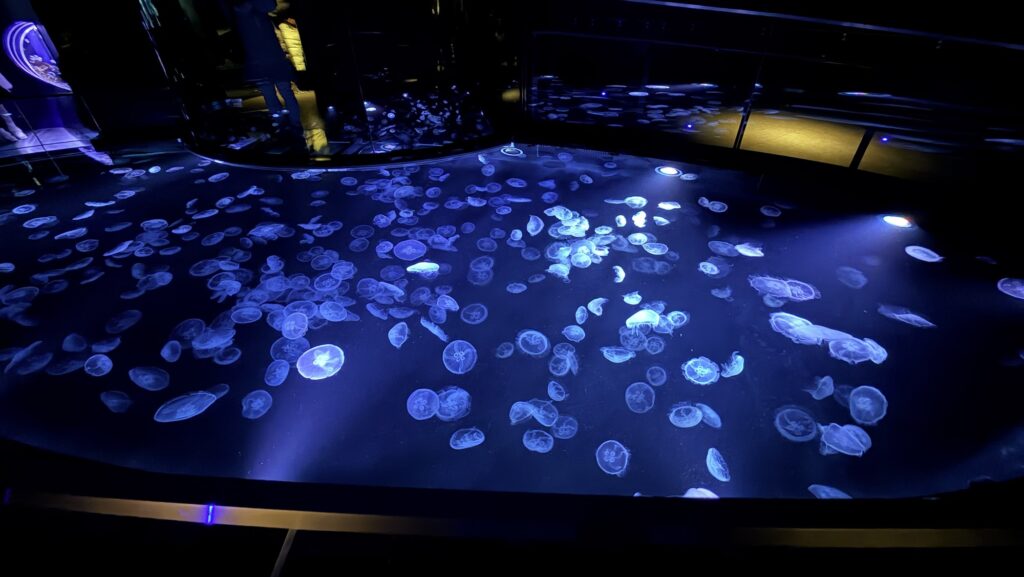 クラゲのビッグシャーレ: 足元まで広がるクラゲの世界に、息子も興味津々。