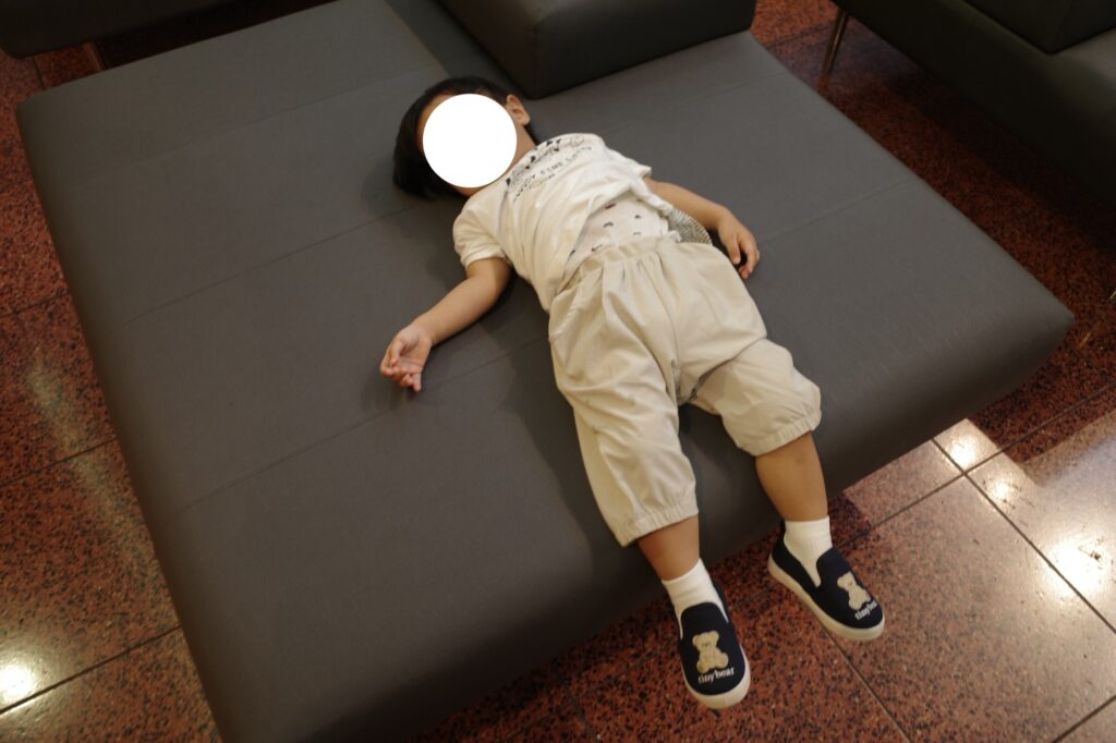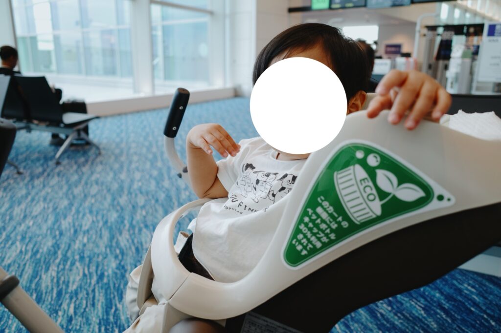 保安検査場を抜けて搭乗ゲートまで距離があったので、空港内のベビーカーを借りる。