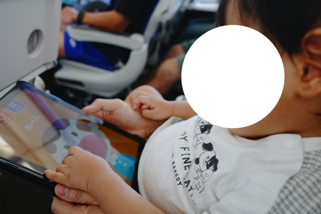 席に着き、絵本とタブレット、おやつをセットし準備完了。なんとか機内の中はこれらで乗り切った。