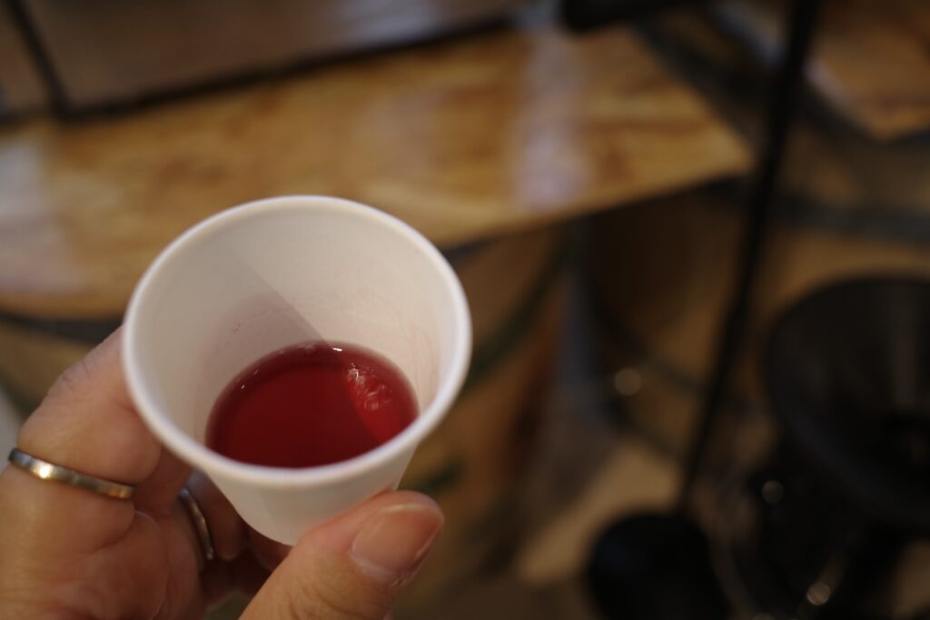入り口で受付を済ませると、試飲用の小さな紙コップを渡されます。 まずはウェルカムドリンクを一杯。 私はお酒は大好きなのですが、正直ワインの良し悪しはよく分かっていません。でも、ここで頂いたワインは甘くてとても飲みやすかった!